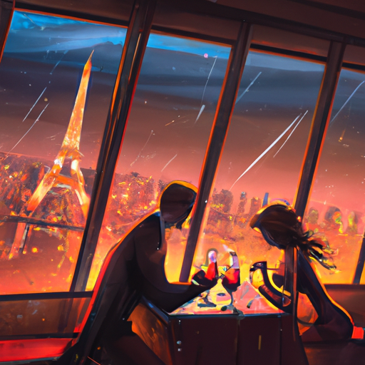 זוג נהנה מארוחה רומנטית במסעדת המגדל, הצופה אל עיר האור